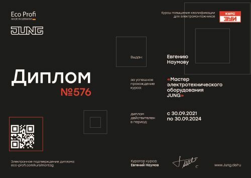 Пройдя курс и сдав экзамен Вы получите сертификат и личную страницу на сайте производителя электроустановочных изделий JUNG с подтверждением квалификации.
